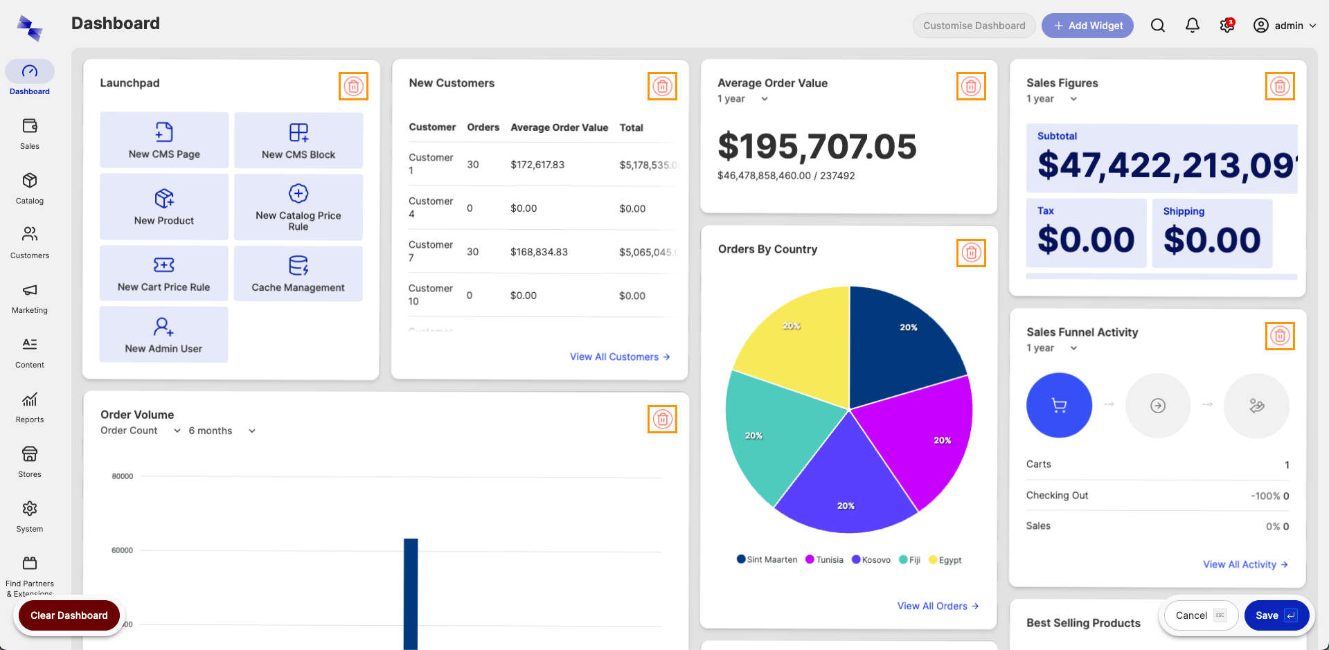 Widgets can be removed from a dashboard individually, in groups, or all at once.